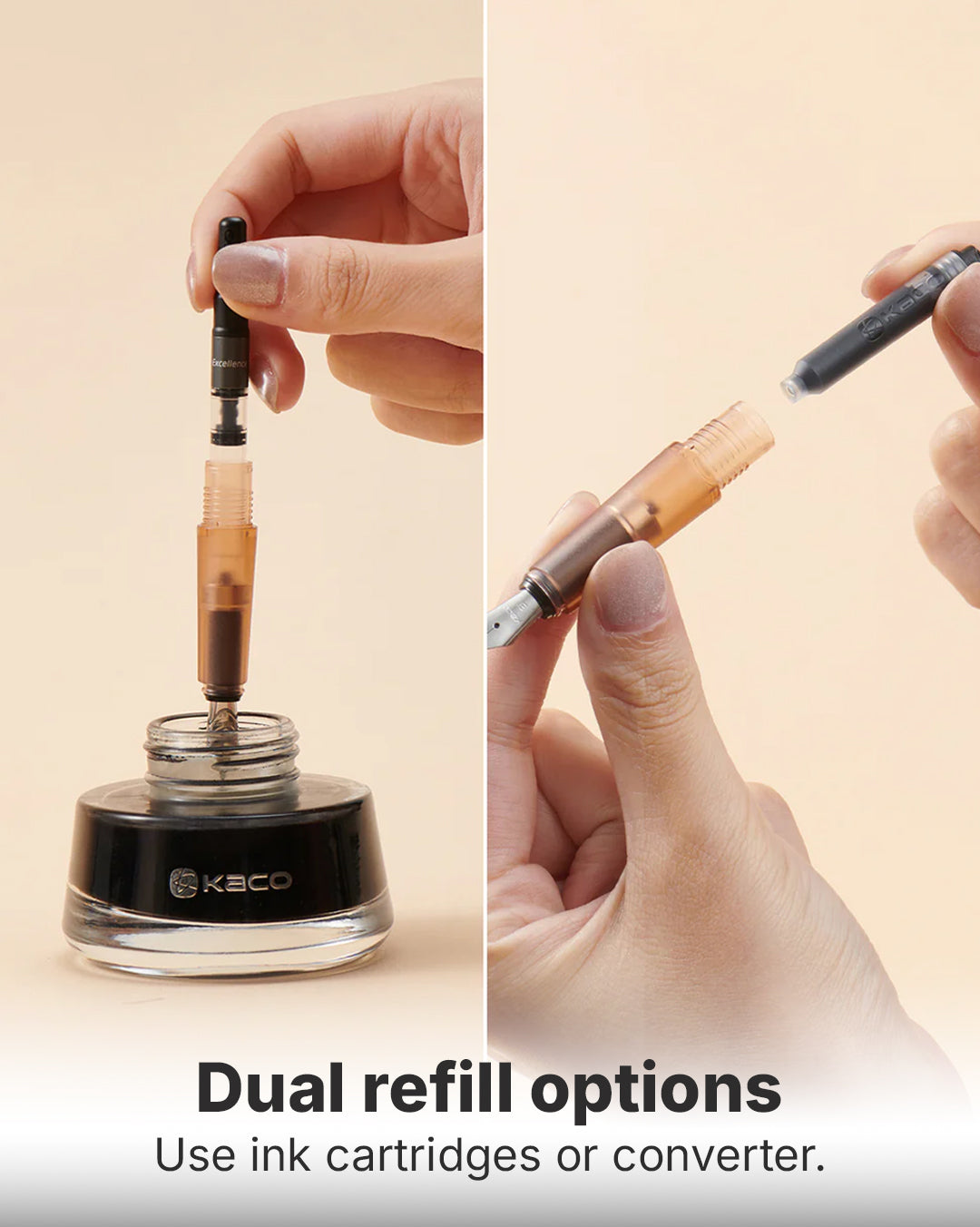 Designed for people who appreciate precision, elegance, and presence, Kaco Fountain Pens turn your regular writing into memorable experiences. Signing an important contract or writing a "thank you" note to a friend or creating your next great idea, your penmanship expresses who you are with every stroke. The smooth flowing ink, the elegant aesthetics, and the comfortable feeling in your hand adds up to more than a pen, it is an extension of you.